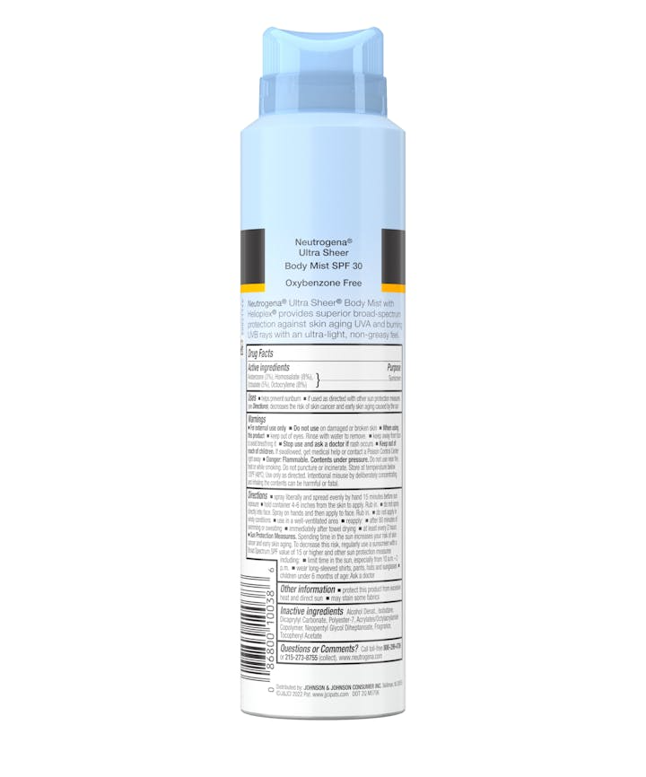 Neutrogena® Ultra Sheer® Body Mist Sunscreen Spray with Broad Spectrum SPF 30 provides powerful sun protection that you will love to wear. Formulated with HELIOPLEX® technology, this non-greasy sunscreen provides superior UVA/UVB protection in a sheer, ultralight finish. Neutrogena® Ultra Sheer® Body Mist Sunscreen with Broad Spectrum SPF 30 is non-comedogenic and oil-free.