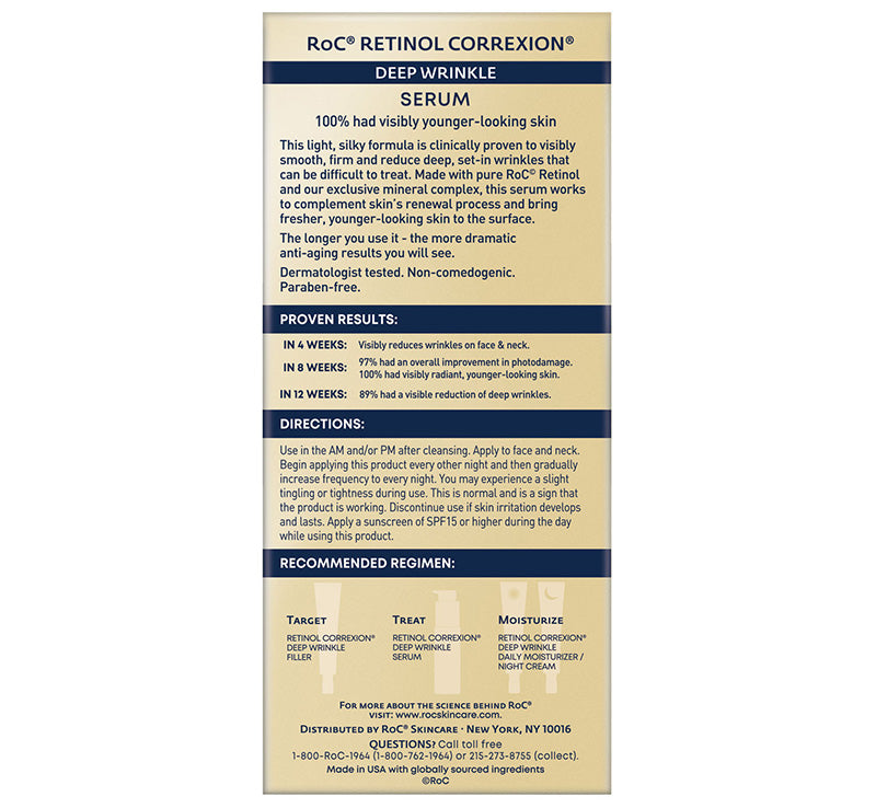 ROC Retinol Correxion Deep Wrinkle Serum is best for an anti-aging treatment that targets stubborn wrinkles, and fine lines and gives smoother, stronger, and more young skin. This ROC Deep Wrinkle Serum is specially formulated with Retinol and Minerals that are deeply absorbed into the skin and provide anti-aging benefits. With the increase in age, our skin's natural collagen production decreases, leading to the formation of wrinkles and fine lines. With the use of this serum every day for a young and desired look.