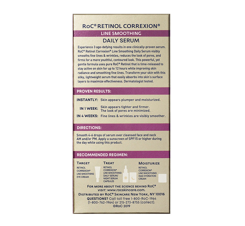 ROC Retinol Correxion Line Smoothing Daily Serum is designed for anti-aging treatment. These ROC Serum are formulated to target and reduce the appearance of fine lines and wrinkles. Infused with retinol and other strong ingredients, this daily serum works to smooth and firm our skin, revealing a more youthful and radiant complexion.